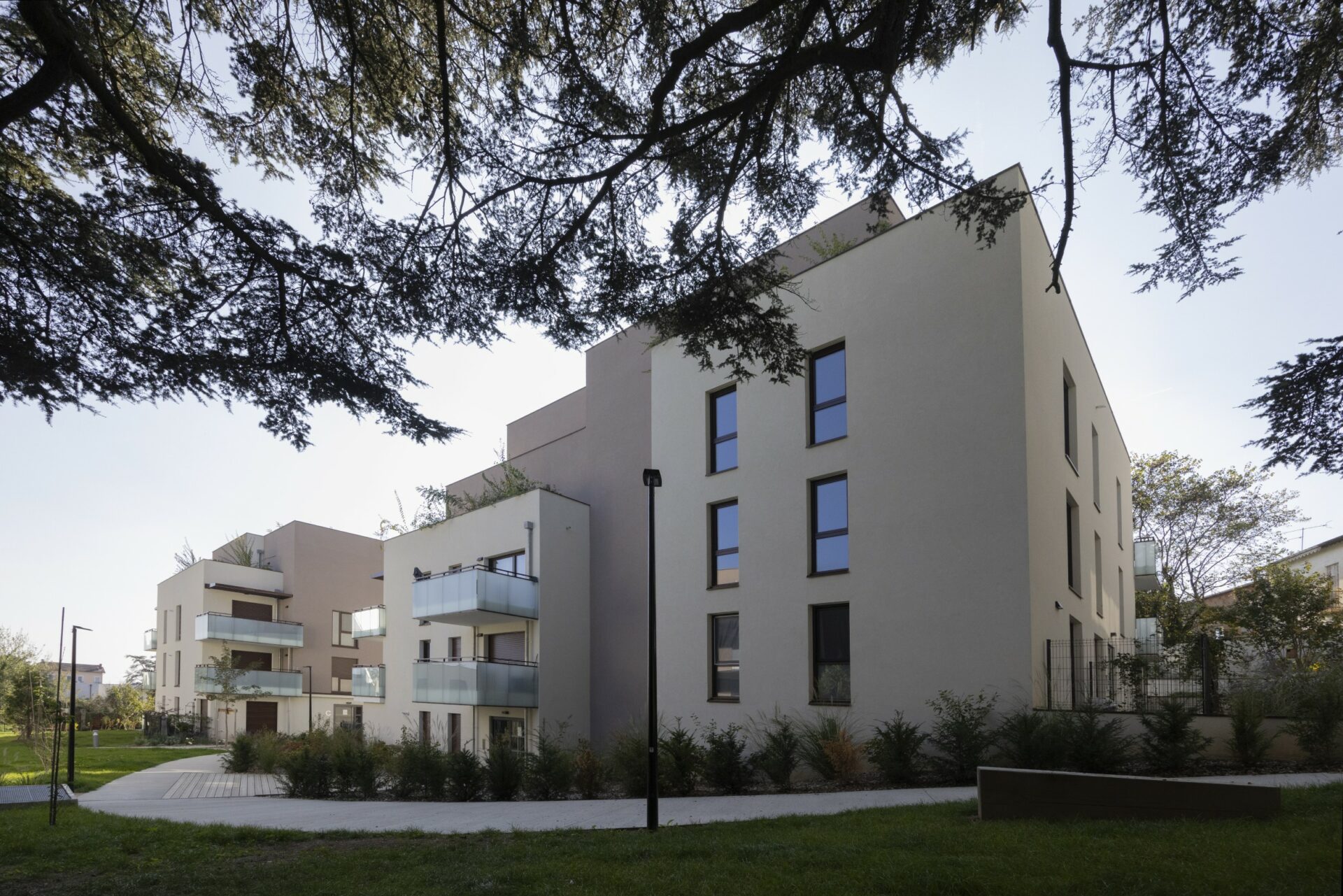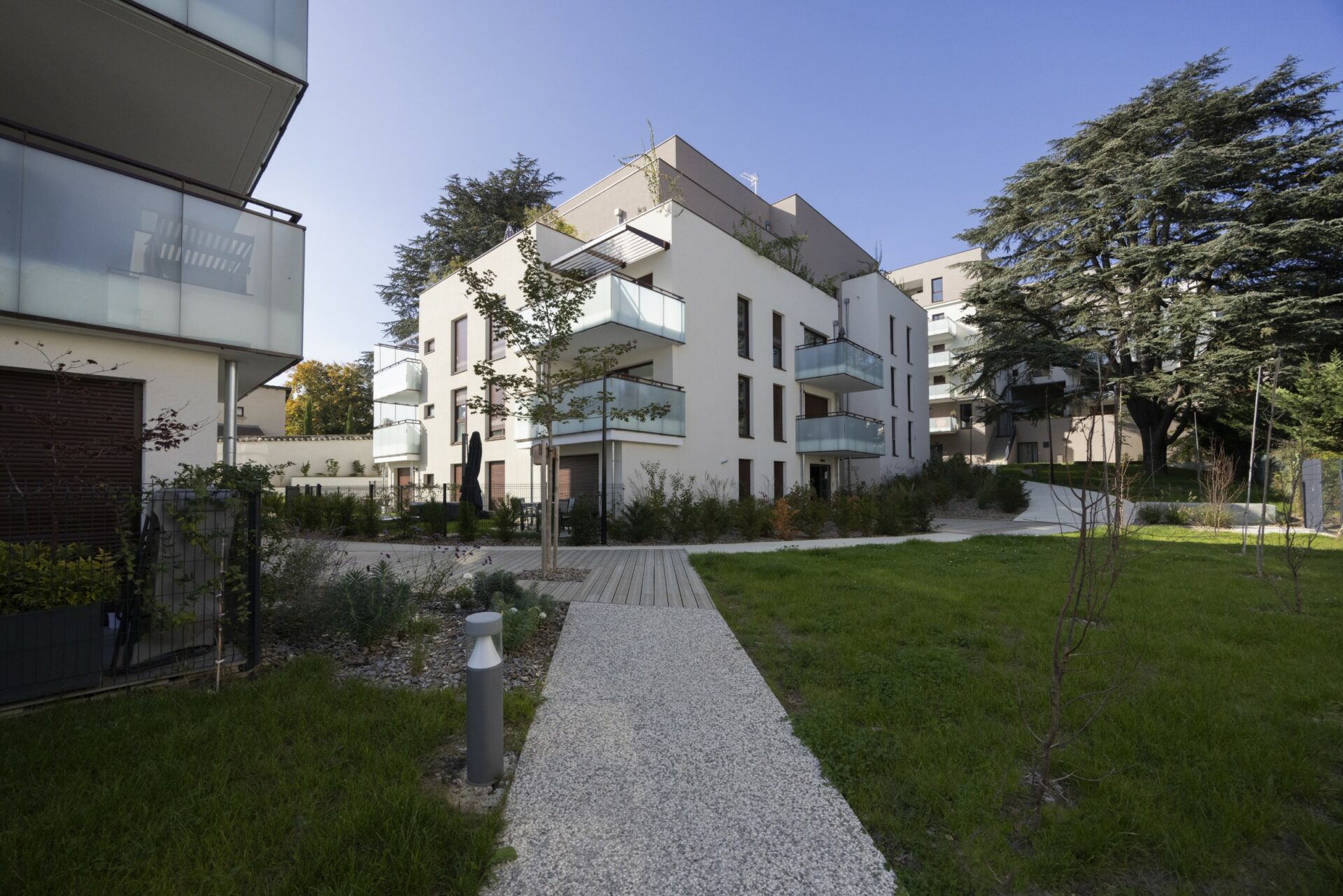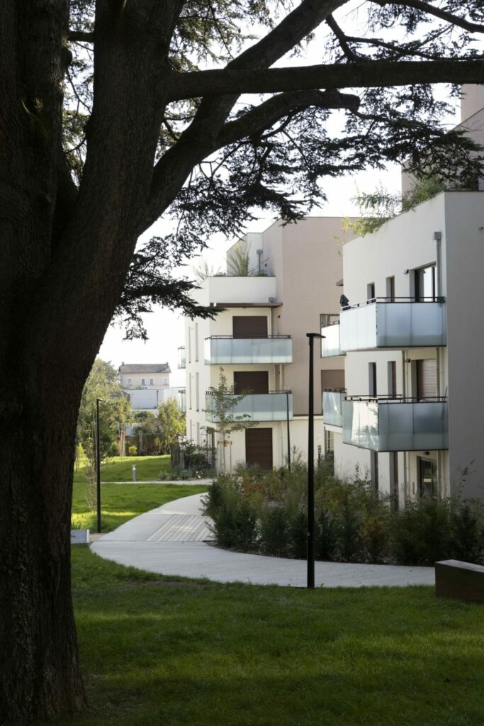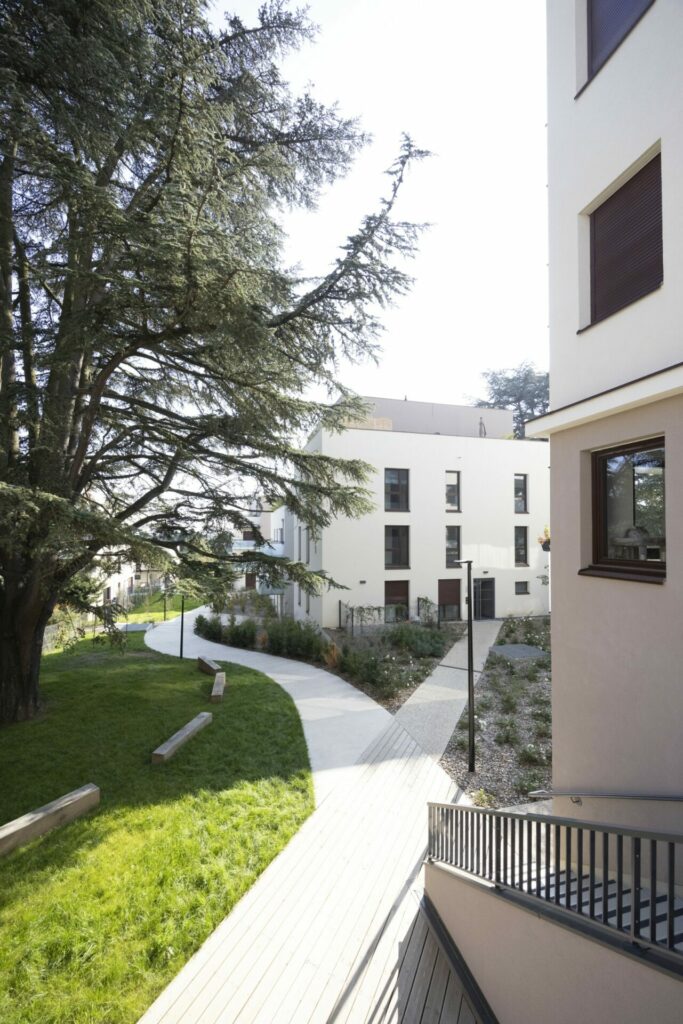 Ce jardin se développe à partir d’un théâtre de verdure composé autour du cèdre préservé, engendrant une succession de séquences piétonnes qui mènent aux deux bâtiments en cœur d’ilot, conçus en R+2+attique.