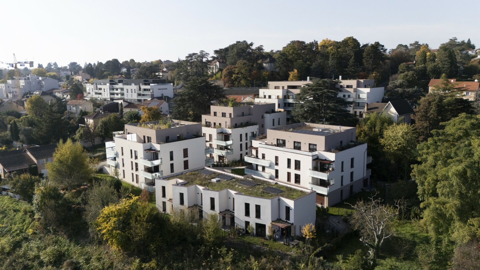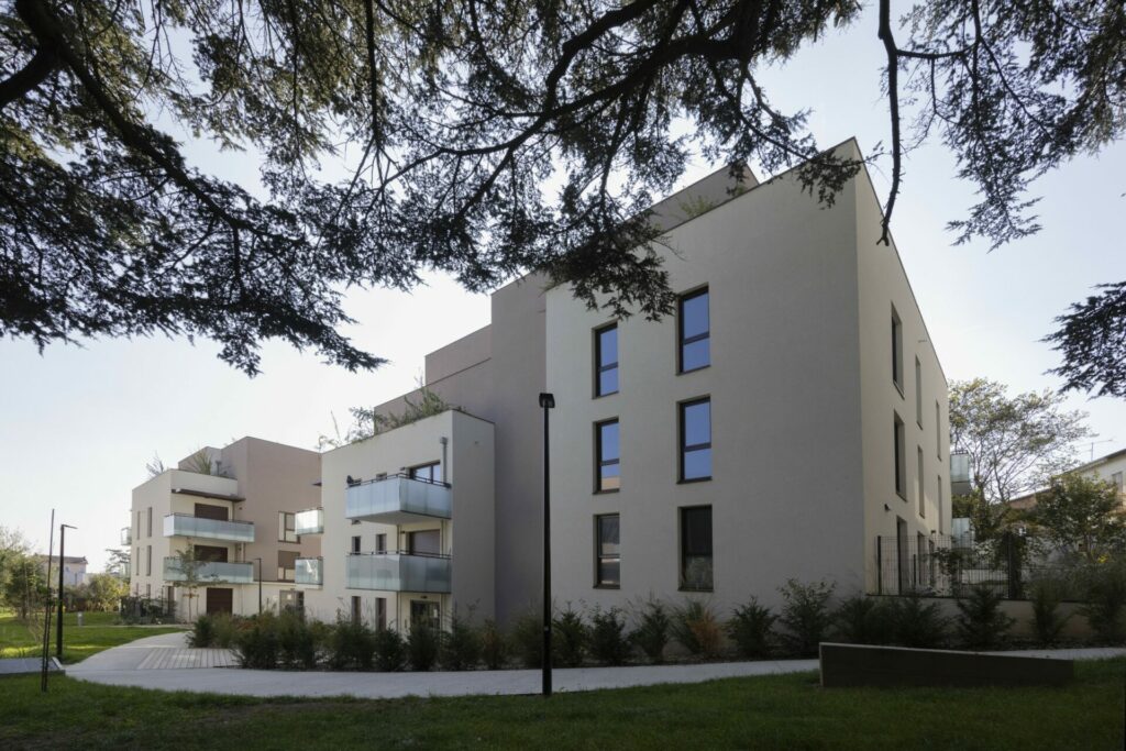 Les bâtiments accompagnent la pente du terrain naturel pour donner vie aux rez-de-jardin, et progresser en cascade, offrant ainsi aux logements de généreuses vues sur le grand paysage. Ces derniers bénéficient tous d’espaces extérieurs confortables : loggias protectrices au Nord ou balcons et terrasses plus ouverts sur le cœur d’ilot, mis en harmonie par leurs habillages en vitrage opalin.
