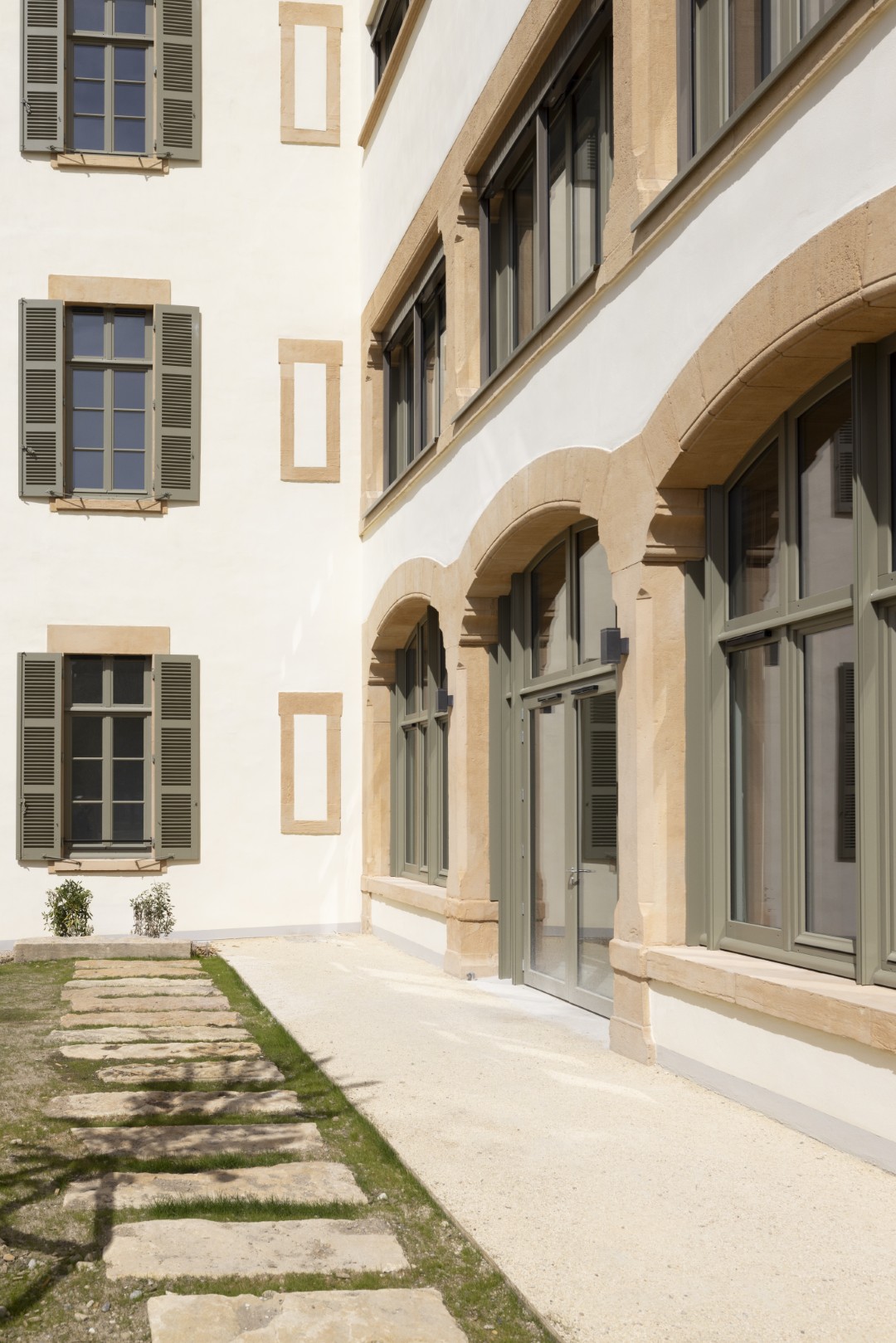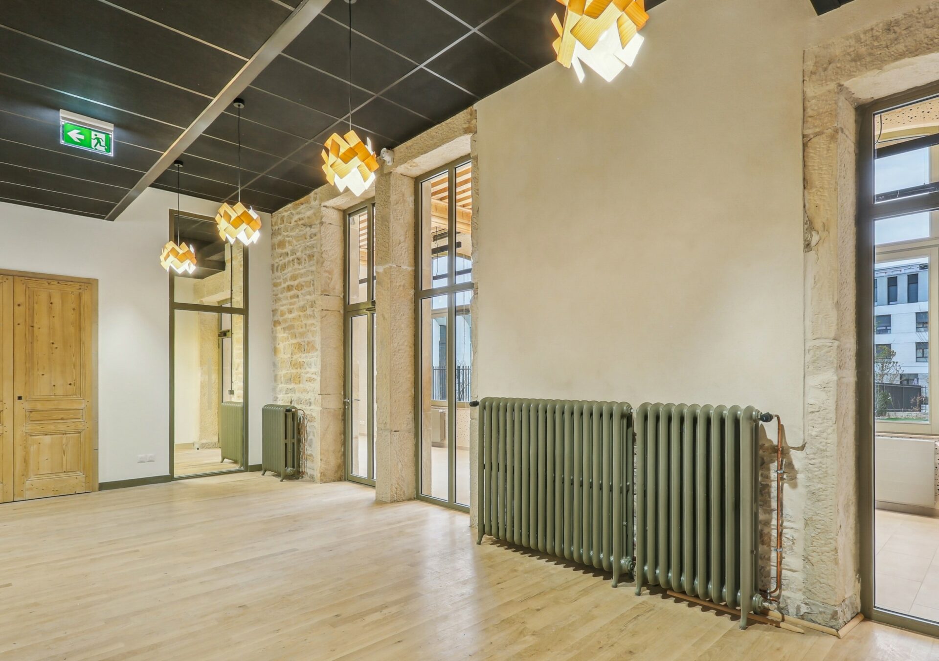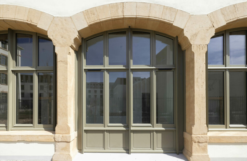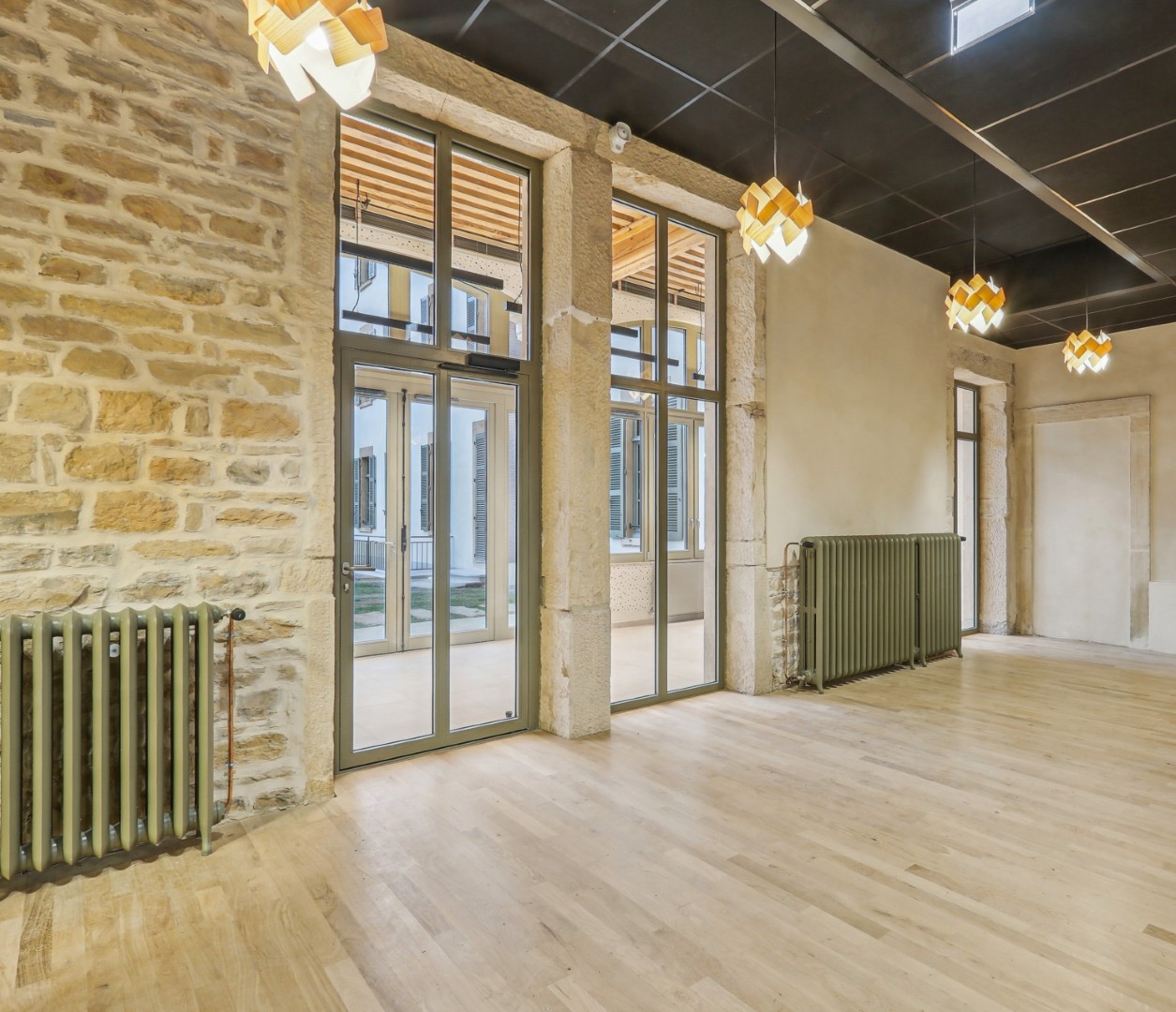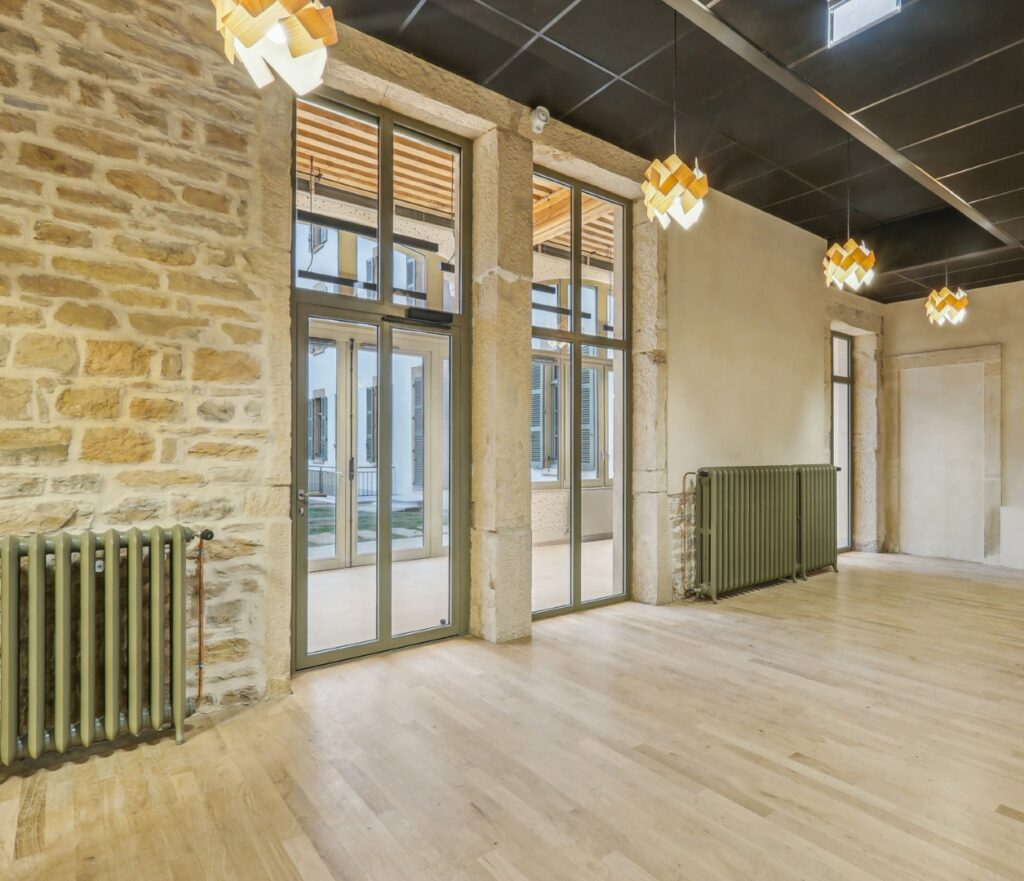 Le diagnostic patrimonial de Axe Architecture permet d’identifier les éléments d’origine à valoriser : réutilisation d’un escalier en pierre en bancs extérieurs, conservation maximum des planchers à structures bois d’origine, réemploi d’ouvrages structurels en pierre massive, remise en valeur de la matérialité des structures, et réemploi des volets bois, de parquets en chêne massifs, de menuiseries bois panneautées, et de radiateurs fonte à ailettes.