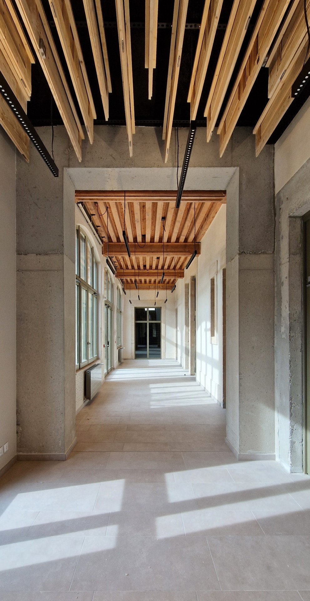 En 2018, la Maîtrise d’Ouvrage et l’Architecte s’engagent conjointement dans une démarche de réemploi, malgré une filière encore peu développée. Si le curage du bâtiment de 3 700 m² permet à l’évidence un réemploi ex-situ (60 tonnes de CO₂ économisées), la qualité des ressources existantes incite à aller plus loin en recherchant des solutions de réemploi in situ.