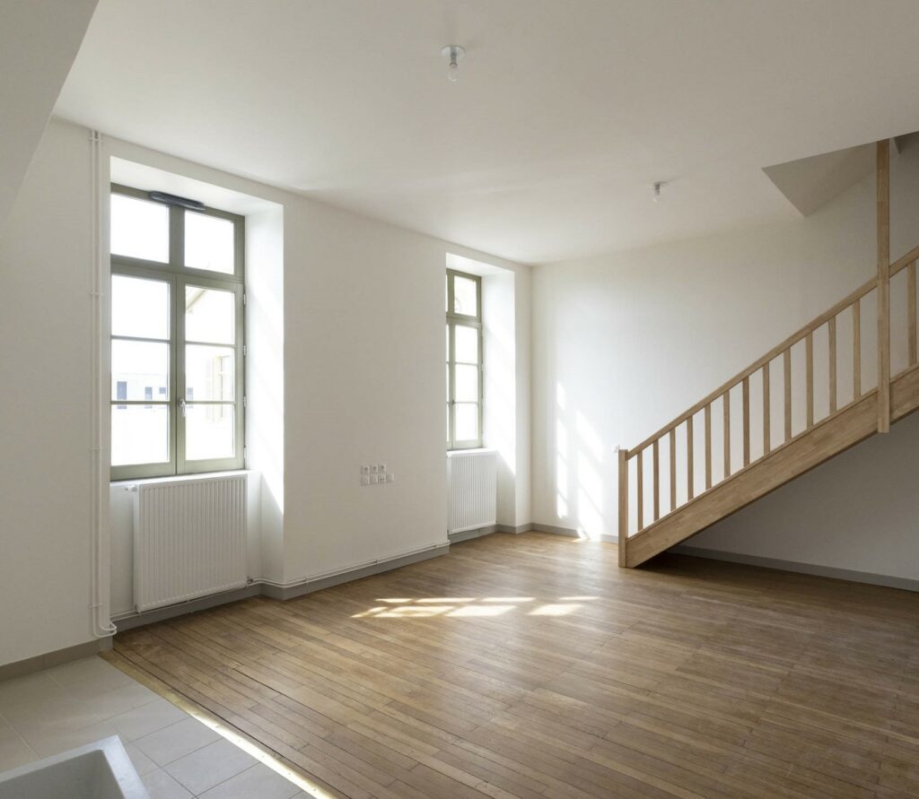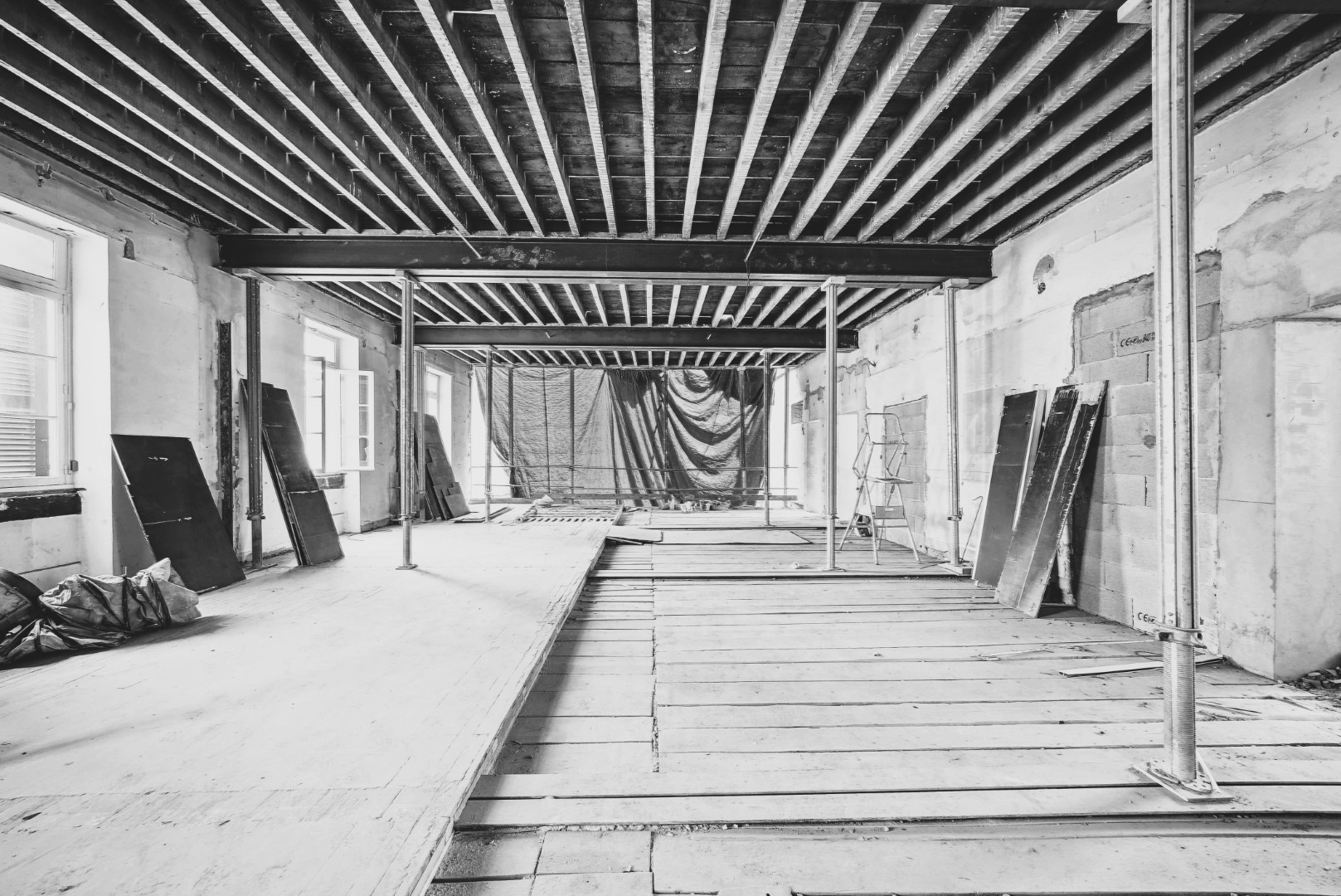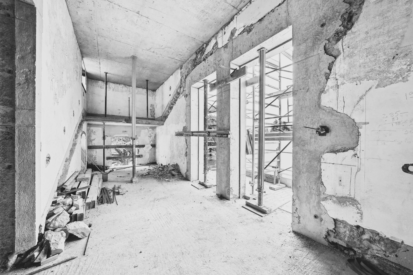 Afin d’optimiser l’emprise au sol et la compacité du projet, le chantier engage une restructuration lourde : surélévation de 2 niveaux sur la partie centrale, démontage d’un escalier, devenu inutile, création d’une nouvelle cage d’escalier dans l’aile la plus épaisse, percements, conservation et renforcement des planchers.