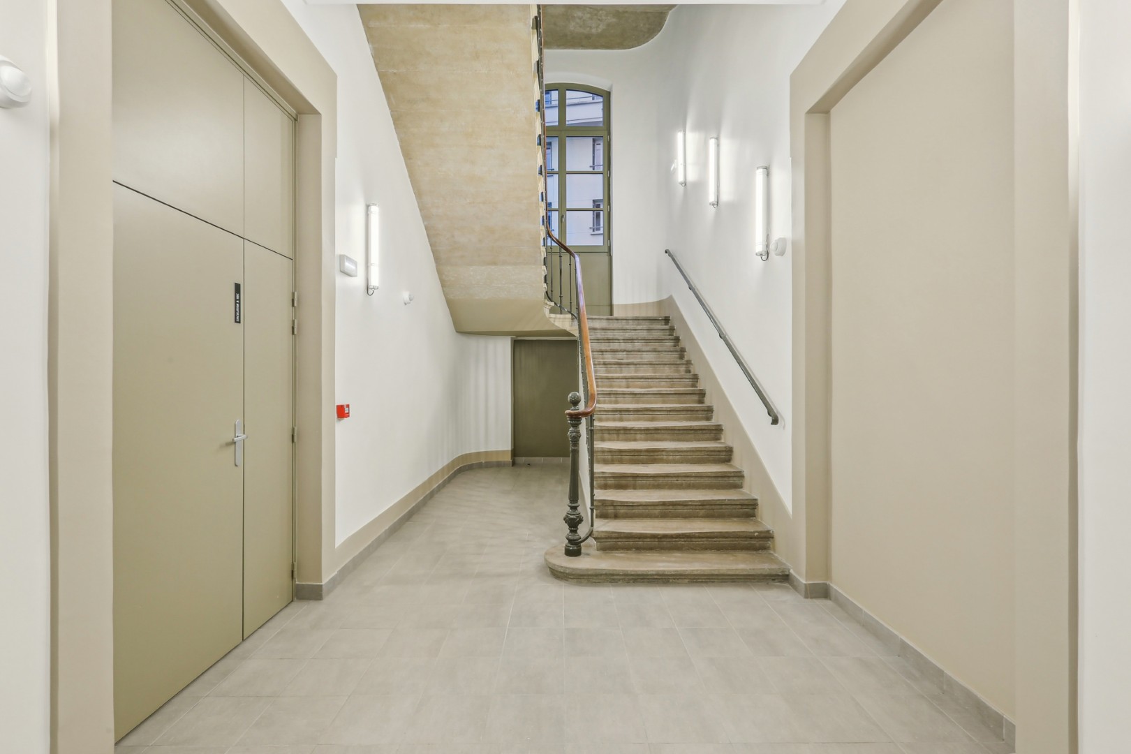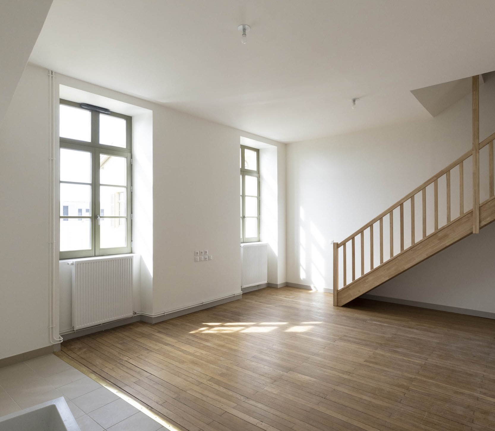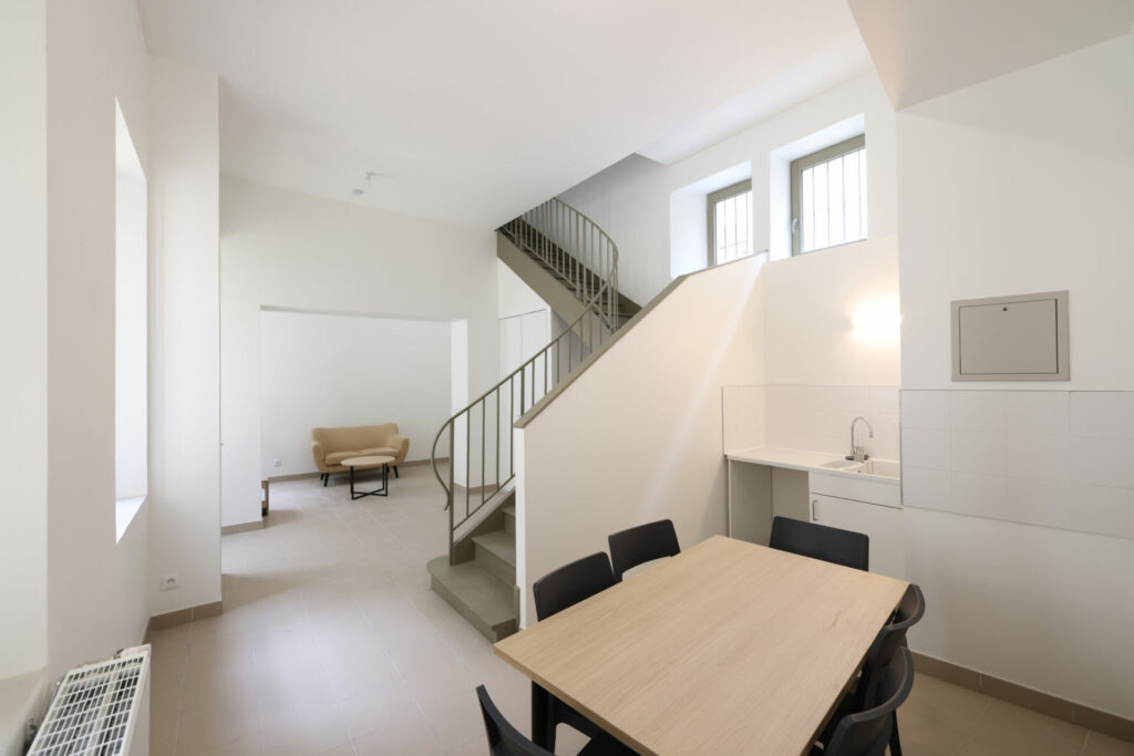 Des recherches programmatiques confrontées aux contraintes et particularités de ce bâtiment unique, ont émergé une série d’idées, qui ont nourri la richesse typologique de la résidence : Autour de la cour extérieure, s’organisent les accès aux parties communes, et également à certains logements, comme le duplex qui prend place dans la maisonnette existante.