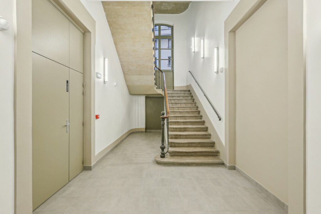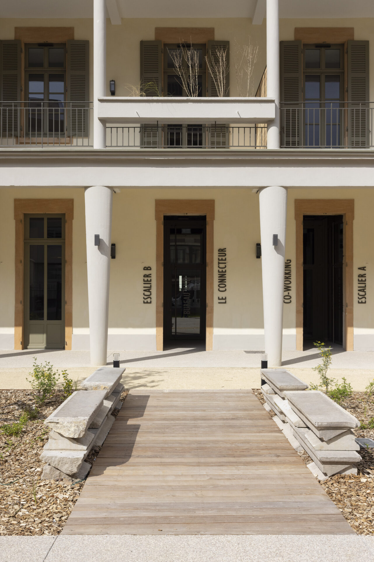 Les parties communes ont été traitées à travers le respect et la mise en valeur des ressources patrimoniales du bâtiment d’origine. En particulier la galerie du coworking, espace unique au plafond à la française, restitue la mémoire de la profondeur du bâtiment d’origine, en se reflétant dans le grand miroir placé dans l’axe de l’entrée de l’ancienne chapelle, autour de laquelle s’organisait l’ancien bâtiment des Petites Sœurs des Pauvres.