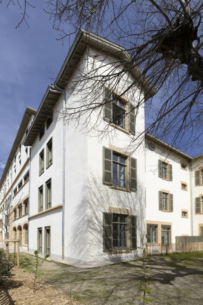 En s’appuyant sur les anciennes coursives collectives de l’ancien EHPAD, le découpage du projet a permis de doter les logements traversants de généreux prolongements extérieurs. Les cages d’escalier jouxtant les coursives, ont permis une innovation typologique : on accède d’abord à la terrasse, véritable espace extérieur, avant d’accéder à l’intérieur du logement. Les ailes en R+3 se sont prolongées en donnant accès à des duplex traversants déployés dans la surélévation en R+4. Les combles ont été traités en grandes mezzanines accessibles via le bas duplex, véritable pièce en plus. Le cœur d’ilot offre un jardin calme et verdoyant, autour d’un espace boisé classé. Une partie de l’histoire du site se lit sur la stratification de la façade Ouest.