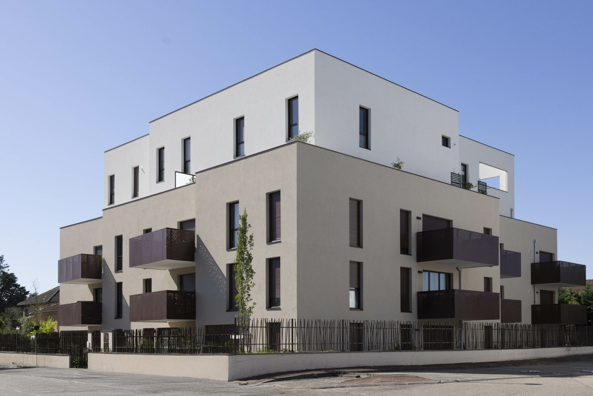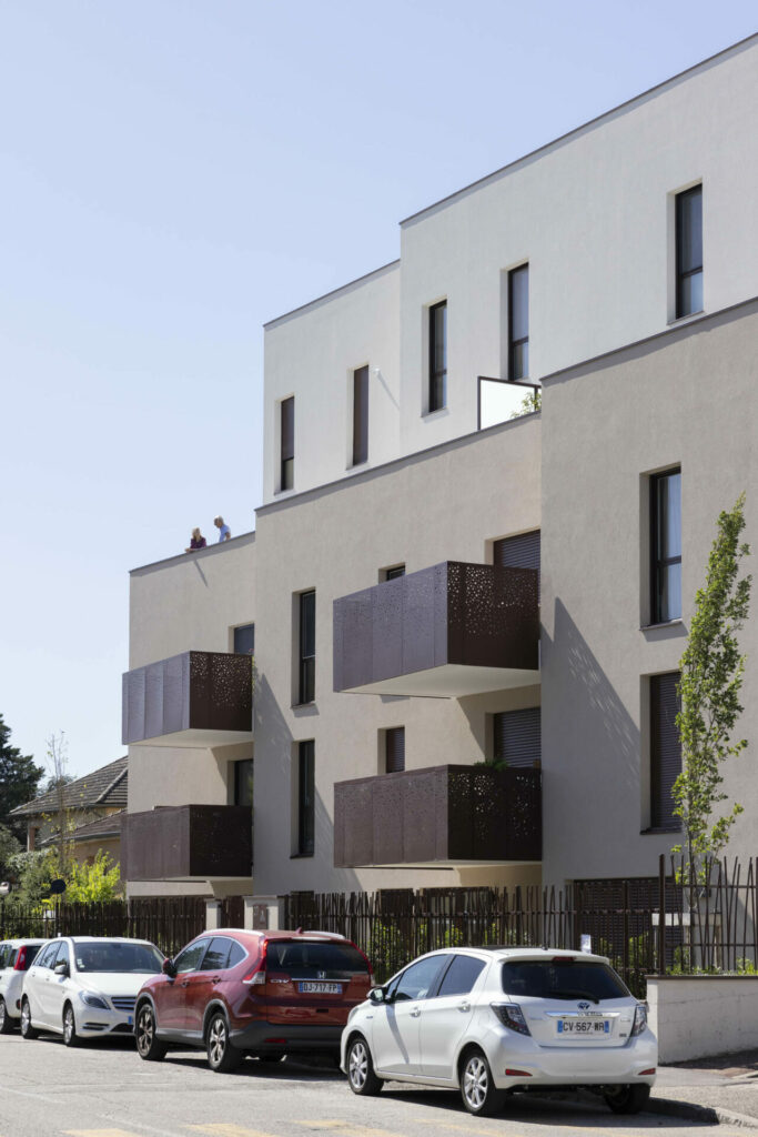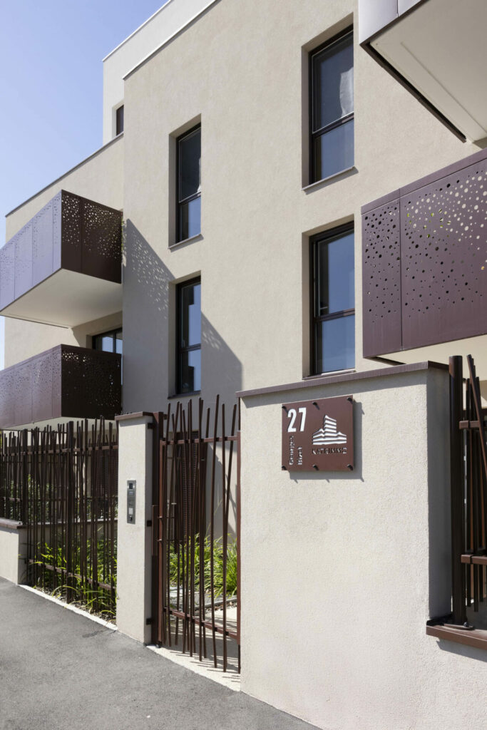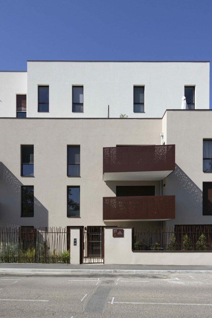 Le volume en R+2+double attique crée un épannelage en douceur, tout en ménageant des espaces extérieurs généreux et qualitatifs dans toutes les directions : larges balcons habillés de tôle perforée en partie basse, terrasses en décrochés au niveau du couronnement, marqué par un enduit plus clair.