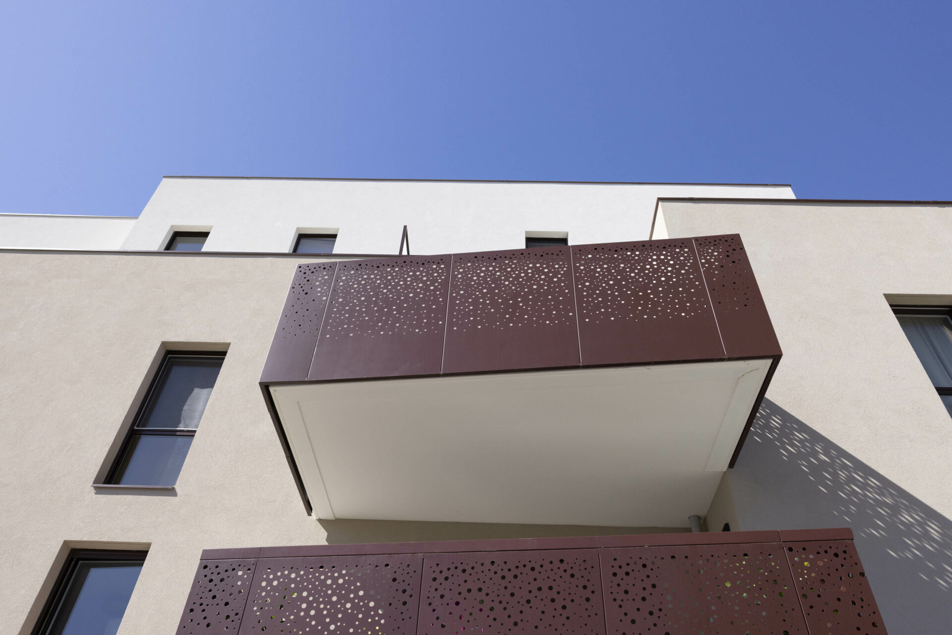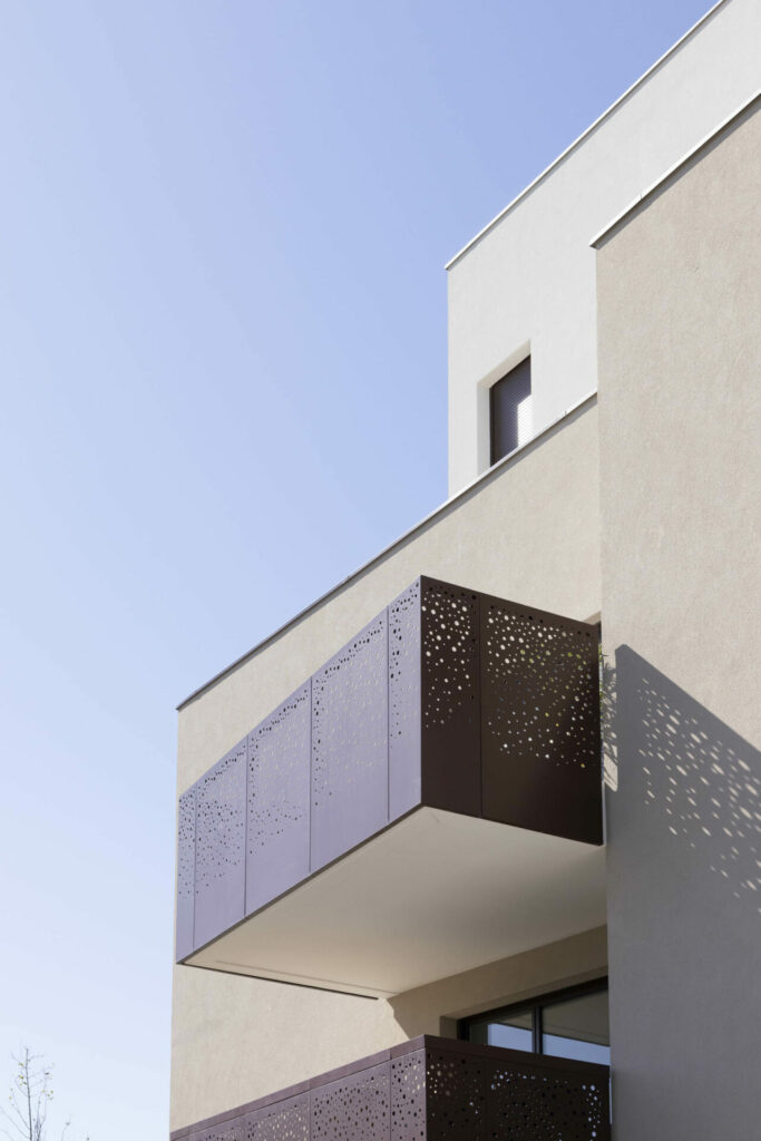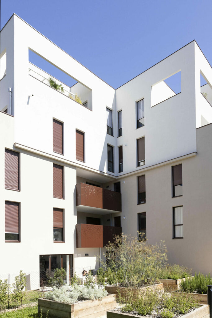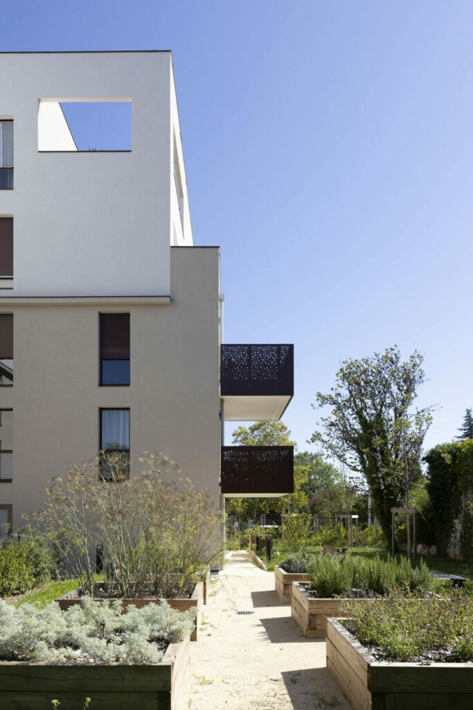 Le volume en R+2+double attique crée un épannelage en douceur, tout en ménageant des espaces extérieurs généreux et qualitatifs dans toutes les directions : larges balcons habillés de tôle perforée en partie basse, terrasses en décrochés au niveau du couronnement, marqué par un enduit plus clair.